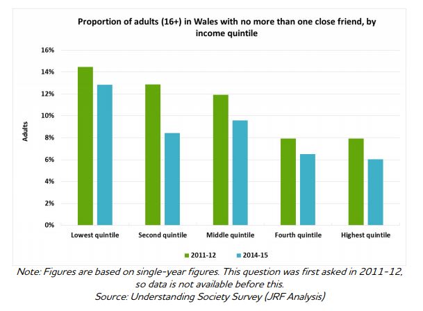 Relationships with family, friends and the wider community can also be effected by poverty. JRF used Understanding Society data to investigate social isolation and found that the proportion of people in Wales who report haivng only one close friend is higher for those in lower-income groups.