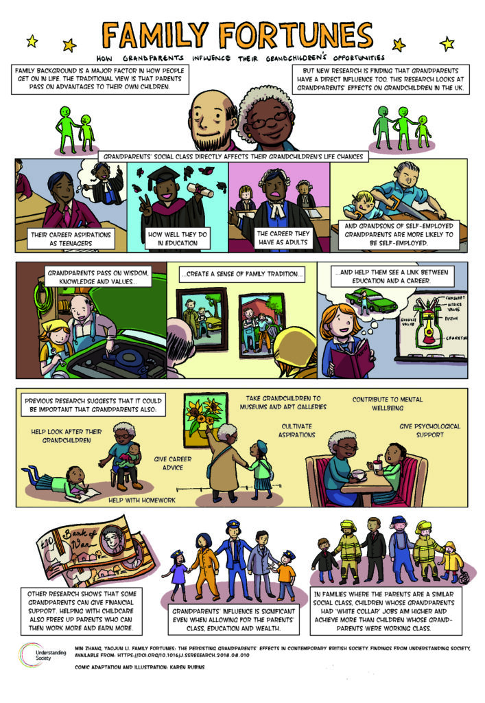 The comic is based on research from Dr Min Zhang, from the University of Cambridge, and Professor Yaojun Li, from the University of Manchester, and uses Understanding Society to look at the impact grandparents have on their grandchildren’s life opportunities.