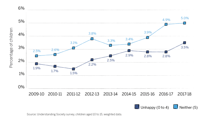 The Children’s Society has produced The Good Childhood Report every year since 2013. The report uses a range of data sources, including Understanding Society, to measure the happiness and wellbeing of children aged 10-15 in the UK. For several years The Good Childhood Report has found that children’s happiness with life as a whole has been declining – this year the report shows another drop in average happiness scores. The proportion of children unhappy with their life overall rose from 3.8% in 2009-10 to 5.9% in 2017-18.